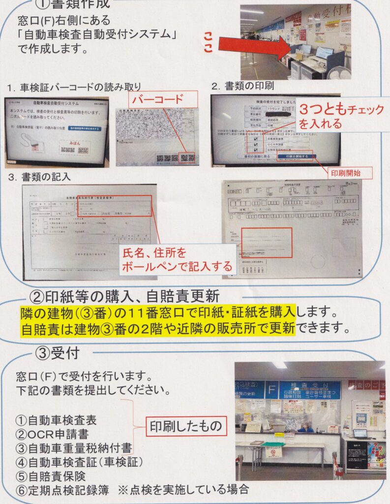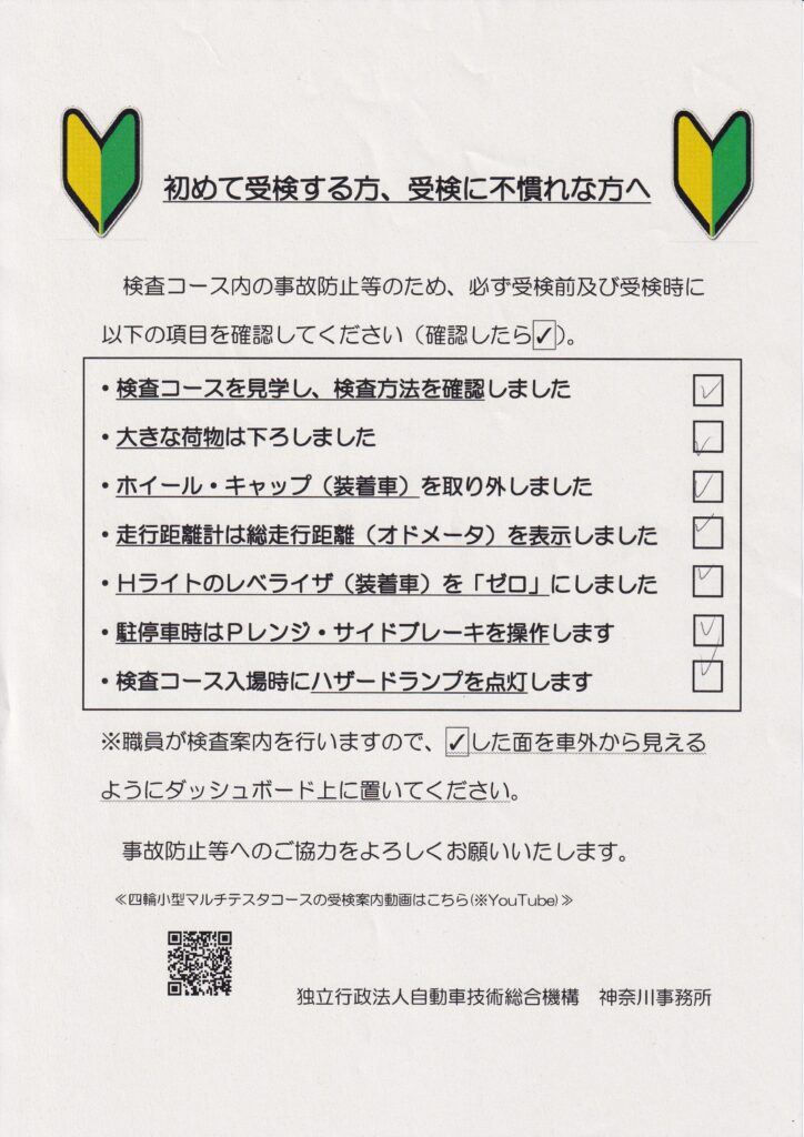 検査前に確認しておく項目と、こちらをダッシュボードに置いておくことで検査員が案内してくれるようになります。