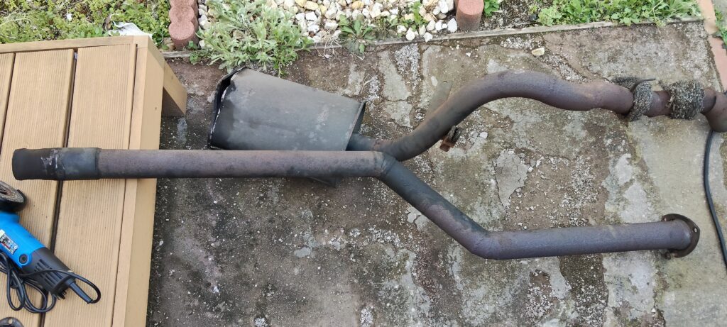 付いていたマフラーは前後のパイプを溶接で取り付けていました。