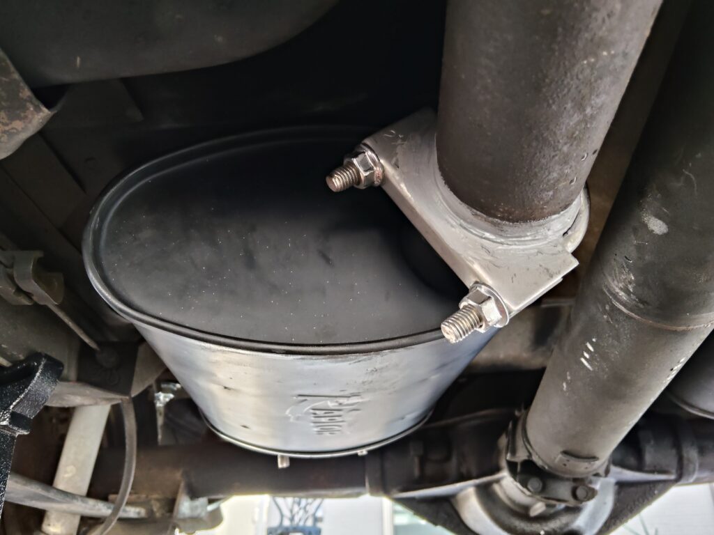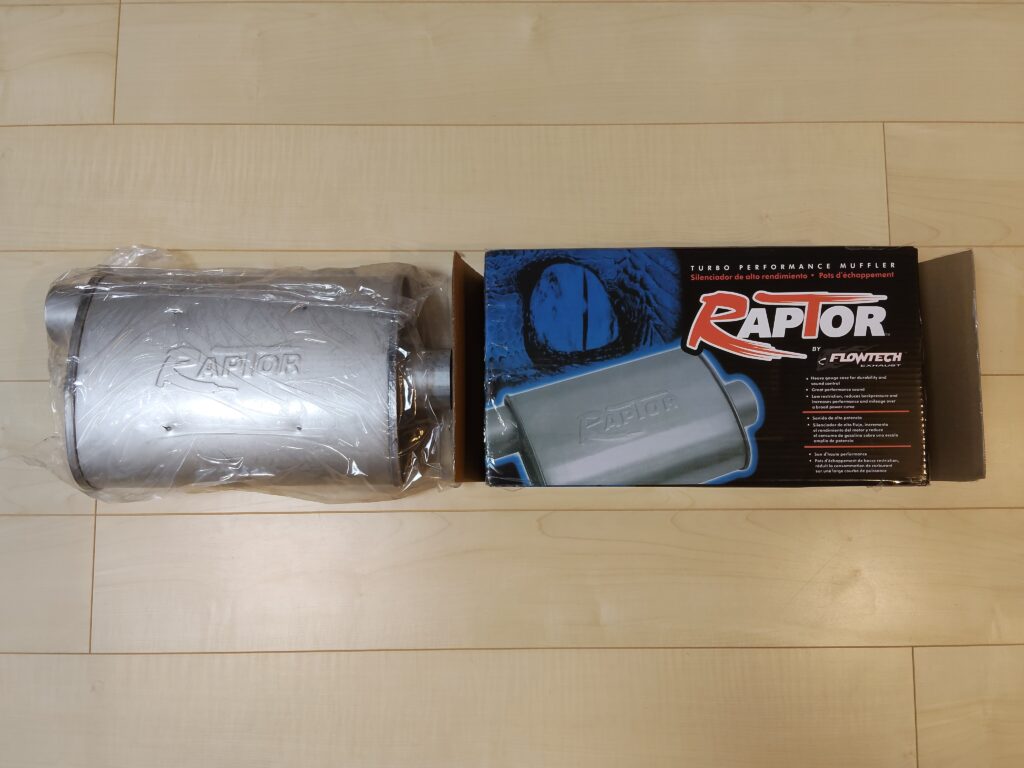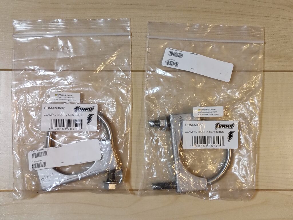 マフラーの接続口外径は2.6インチほどありますが、2.5インチ用Uボルトクランプで取り付け可能です。